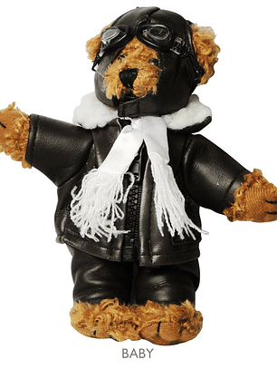 Tierno Oso Teddy Bear de 23 cms de alto, el cual viene con traje de piloto: Chaqueta de cuero y chiporro con cierre, casco, lentes y gorra.
