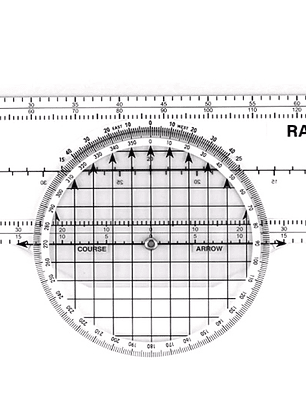 - 8 funciones incluidas en este trazador. Mide en millas náuticas (parte delantera) y millas estatutas (parte trasera) junto con escala seccional (1:500,000) escala WAC (1:1,000,000) y área terminal (1:250,000). Cuenta con azimut giratorio para lectura directa del curso.